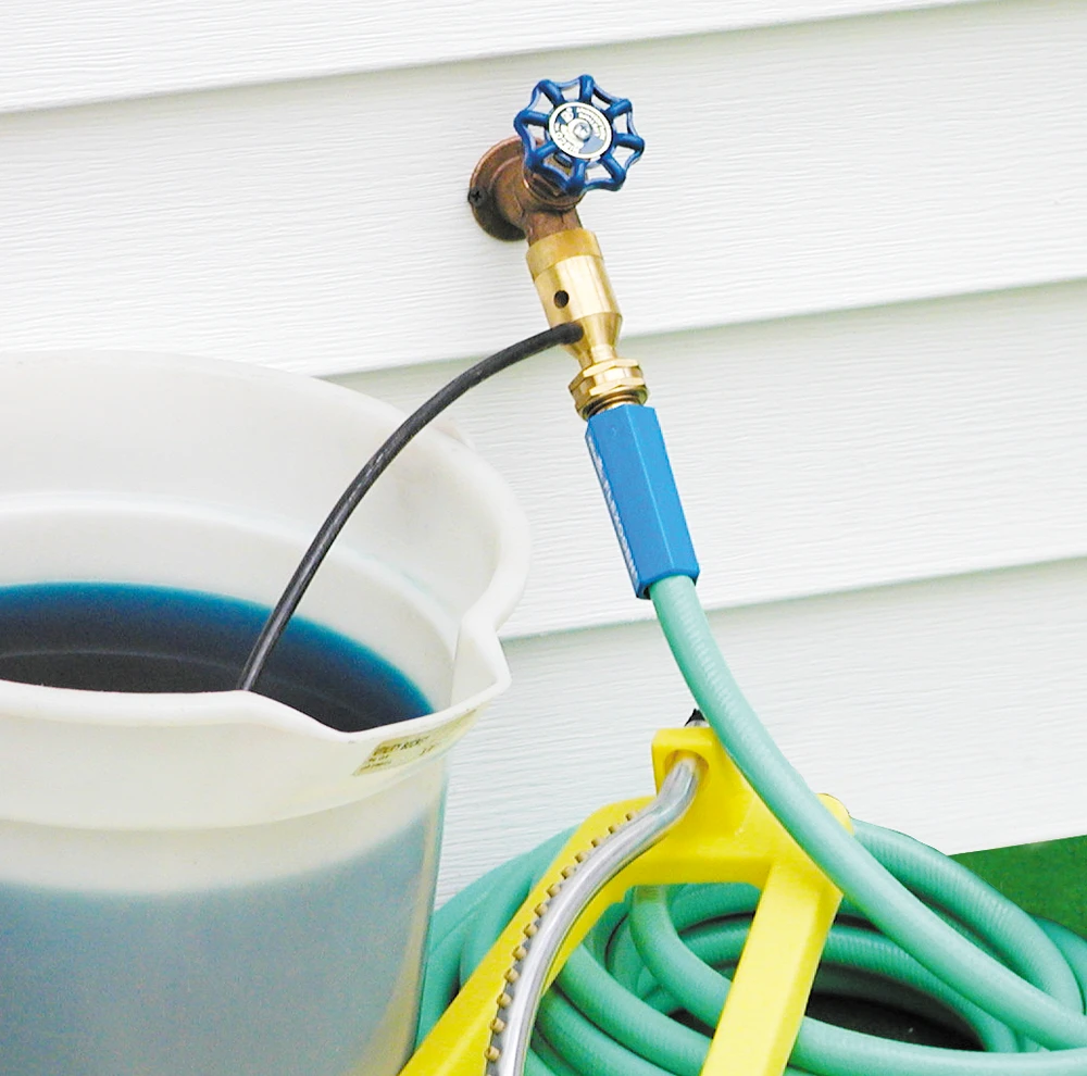 When mixed with water from the hose, the solution will come out of the hose end at the recommended rate of 2 TBSP per gallon (3.8L). The Hozon will draw one gallon (3.8L) of concentrate in about five minutes, and this will be mixed with approximately 12 to 18 parts of water through the hose, depending on the flow rate.
