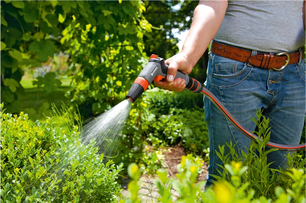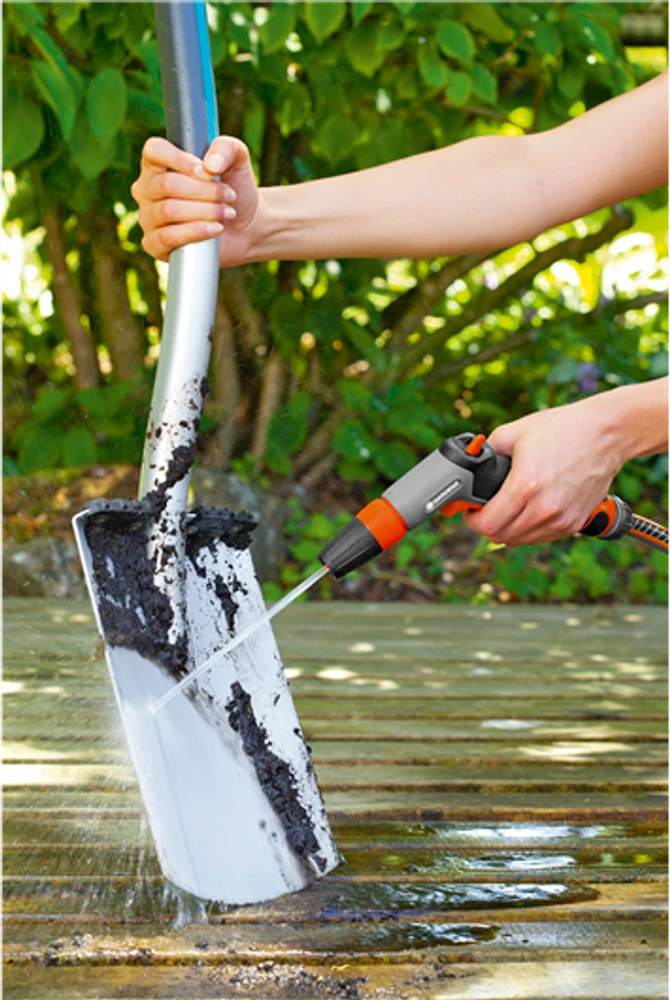 The GARDENA Classic Trigger Gun Nozzle with its infinitely adjustable twist nozzle offers everything you need for cleaning and watering jobs in and around the garden. Its hard jet function is suitable for cleaning and the fine mist function is ideal for spraying fragile plants. Ergonomic design with flow control & trigger lock allows for comfortable one-handed operation. Its soft plastic tip on the head protects from damage.