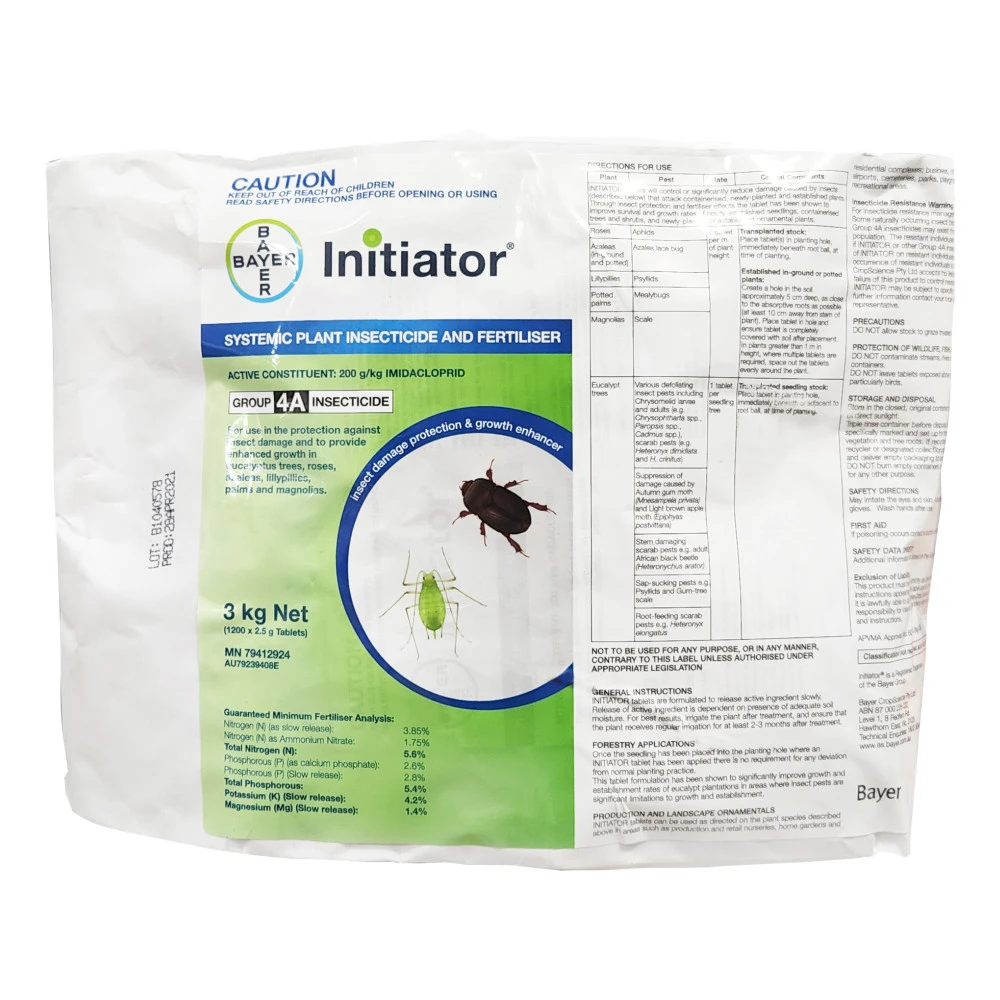 Initiator tablets provide enhanced growth and long-lasting protection against the damage caused by various insects that attack containerised, newly planted and established plants. The tablets are designed to be placed in the soil adjacent to plants or in the planting hole during transplanting of seedlings, so that the growing plant can take up the fertiliser and the systemic insecticide imidacloprid.